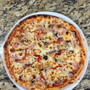 Sos de rosii, mozzarella, jambon, carnaciori & crenvursti, masline negre, ciuperci, cascaval afumat, ardei rosu